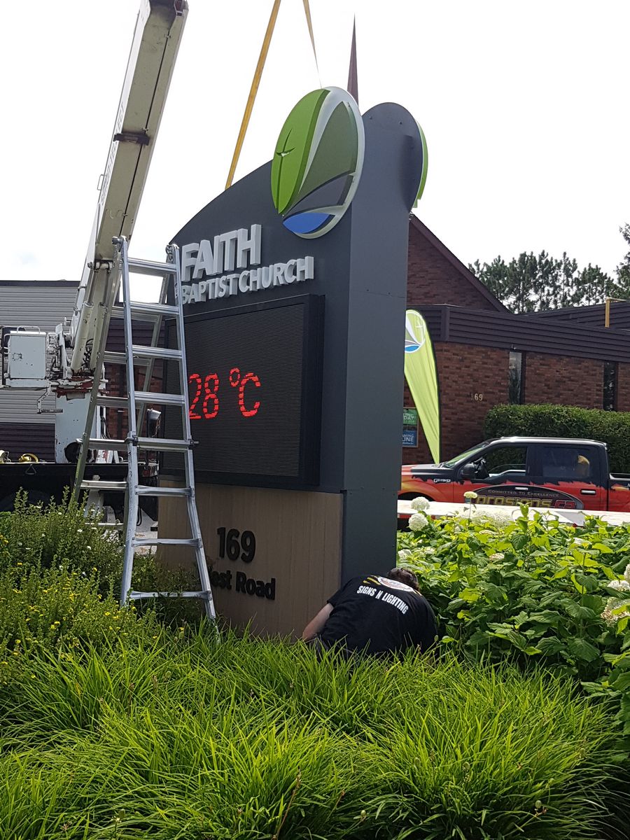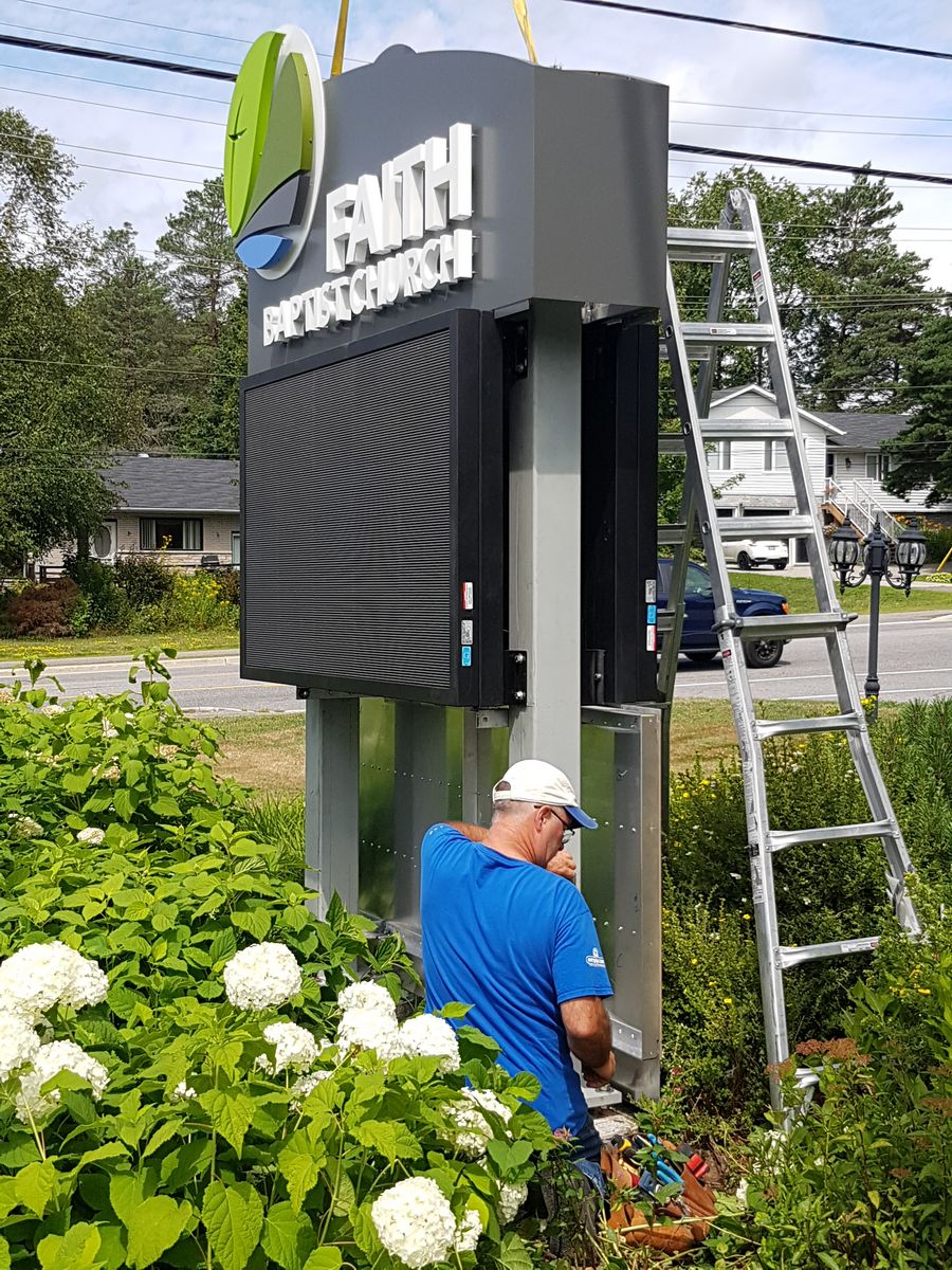 The wonderful folks at Faith Baptist Church in Huntsville wanted to show their community that they offer many services to meet the needs of folks looking for connection and genuine care. With this in mind, they approached Prosigns.ca to design and provide an updated illuminated ground sign with a programmable LED screen on each face. This was the best way to inform the community in a colourful and attractive way what goes on in their facility without losing the natural look of stone and wood.